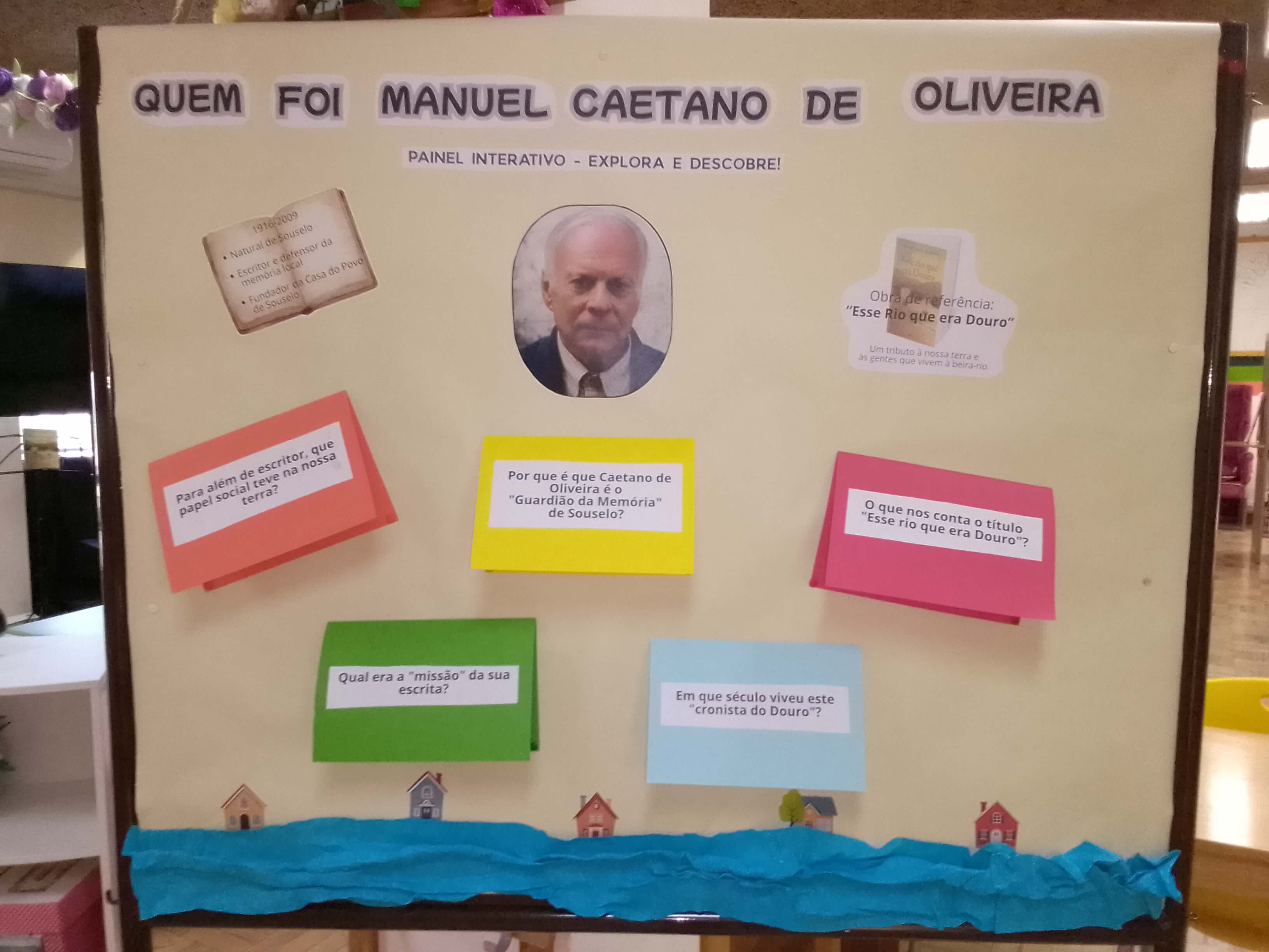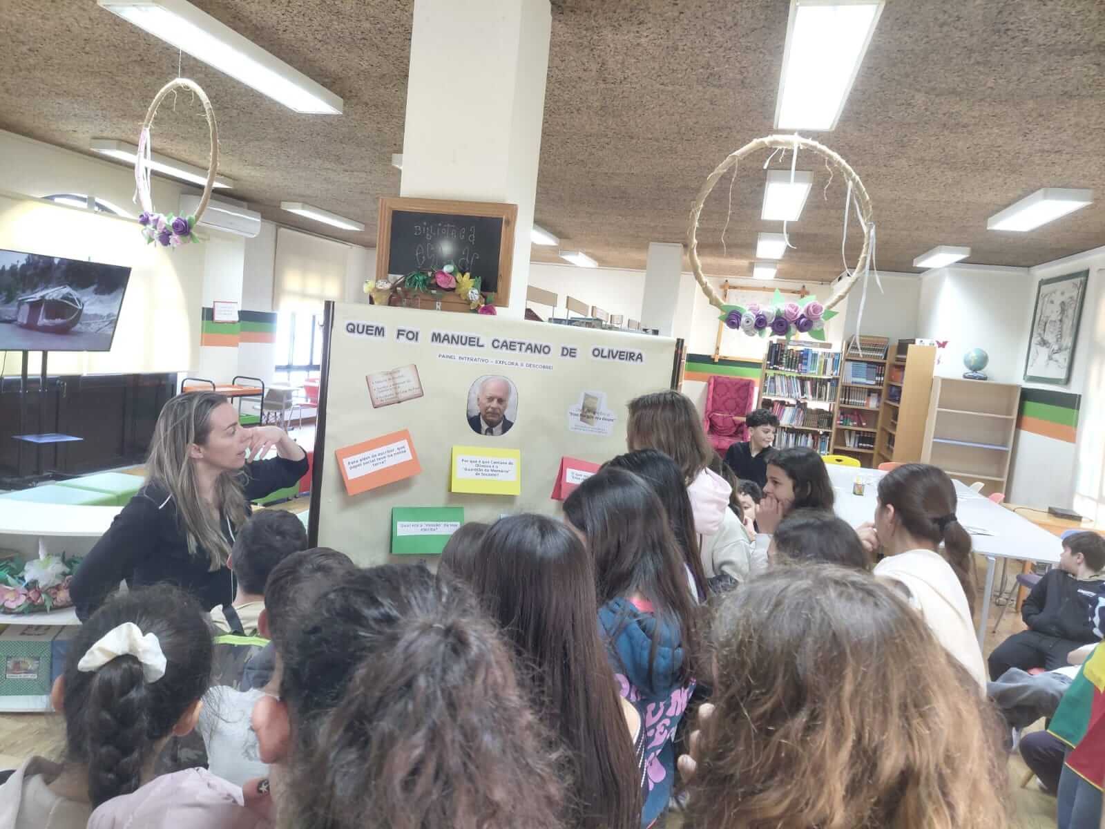 A experiência iniciou-se com a exploração de um mural biográfico interativo dedicado a Manuel Caetano de Oliveira, patrono da Biblioteca e reconhecido como um verdadeiro guardião das memórias da nossa terra.
