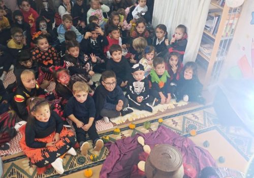 A escola estava decorada com bruxas, fantasmas, abóboras e chapéus de bruxa confecionados pelas crianças em parceria com os encarregados de educação. A bruxa contou a história “desculpa… por acaso és uma bruxa?”, fez uma poção mágica azul com ingredientes horripilantes que depois bebemos e ainda ofereceu uma doçura as crianças. Foi muito divertido.