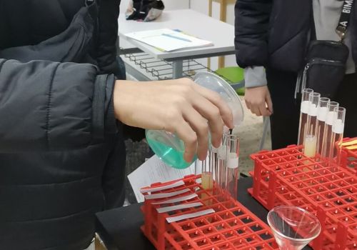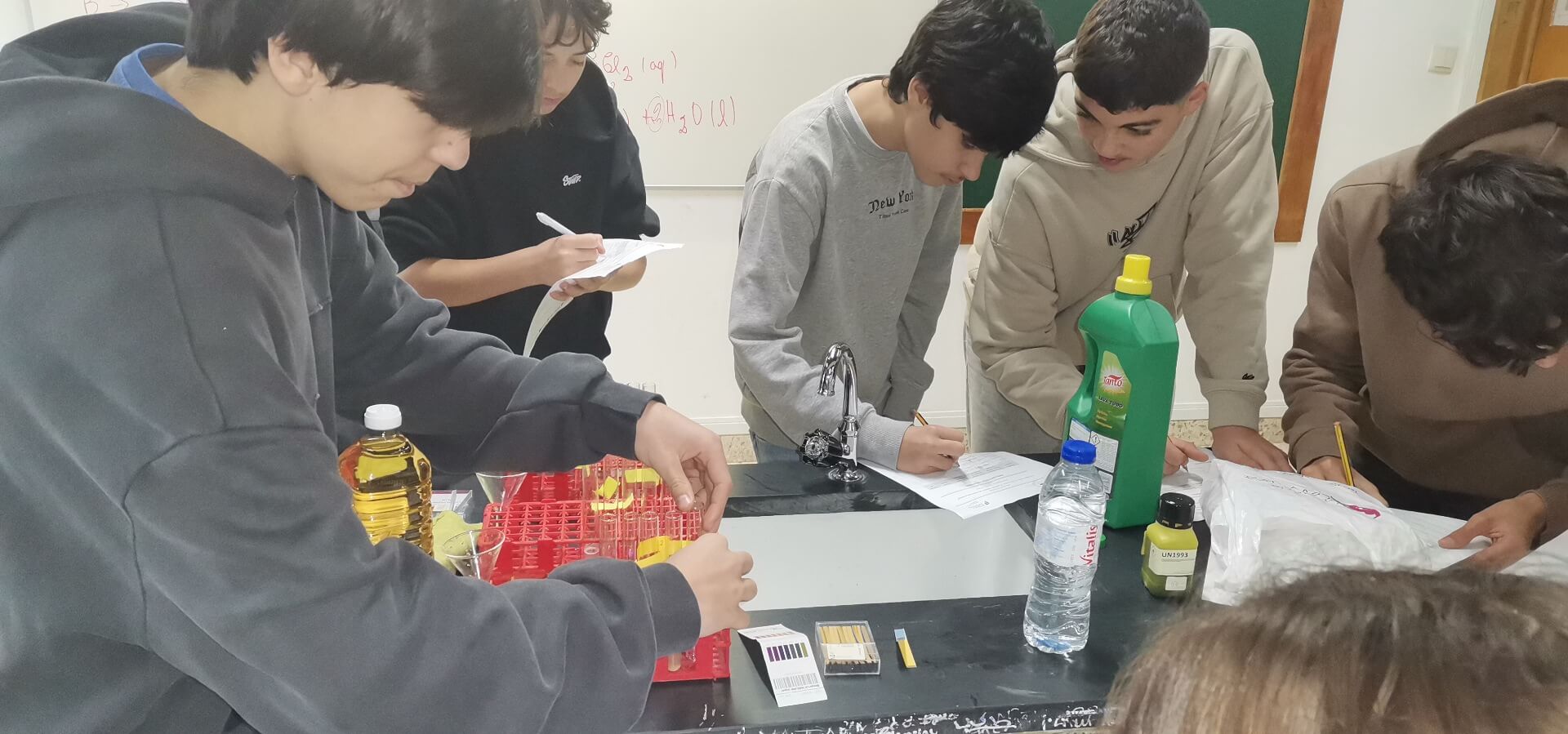 Sob a orientação da Professora Tânia Esperanço, os jovens cientistas puseram a "mão na massa" (ou melhor, nos reagentes!) para testar o carácter químico de alguns materiais de uso comum no nosso dia a dia, tais como: vinagre (ácido acético), lixívia, detergente amoniacal, limpa-vidros, sumo de limão e água salgada, por observação da mudança de cor dos indicadores colorimétricos de ácido-base: solução alcoólica de fenolftaleína, tintura azul de tornesol e indicador universal (em papel) e verificarem a respetiva correspondência dessas cores, na escala de pH de Sorensen.