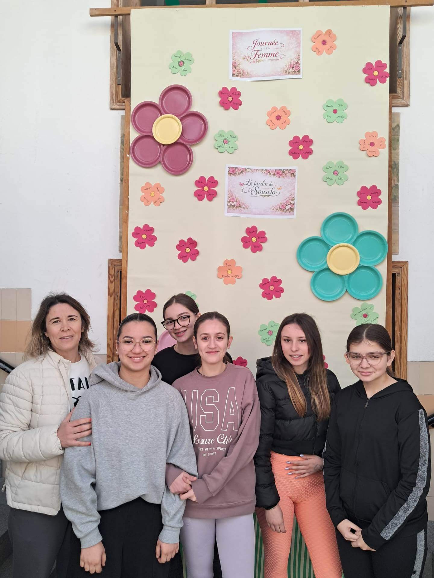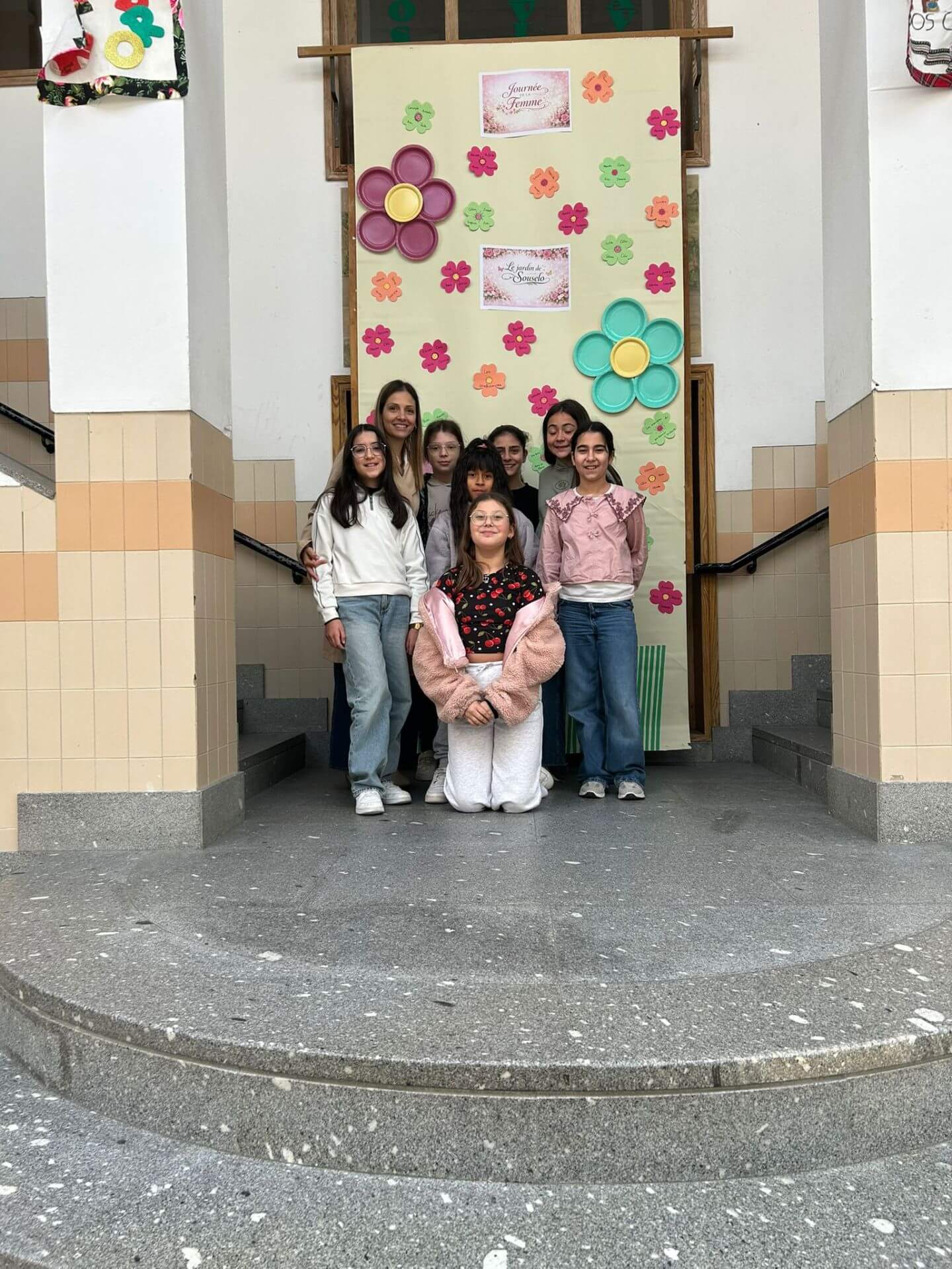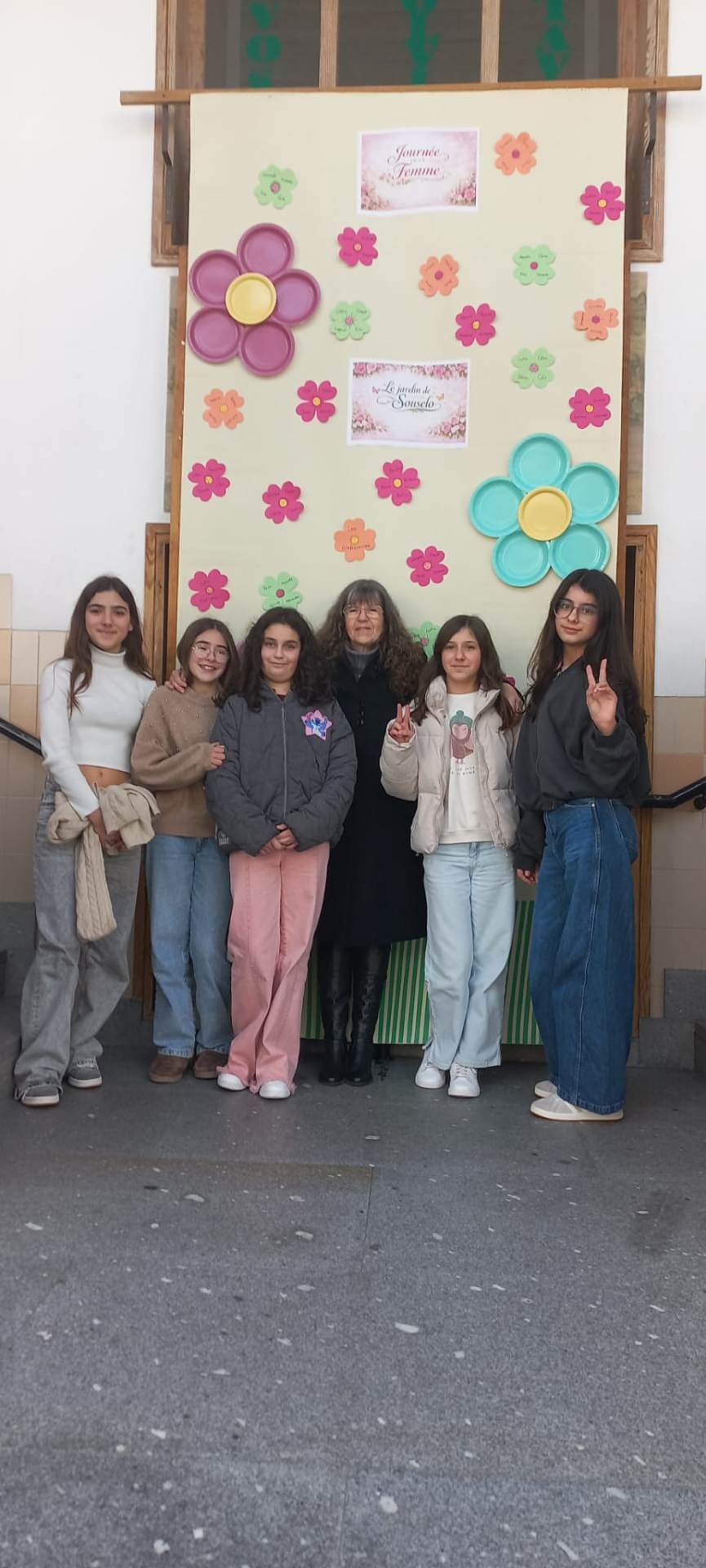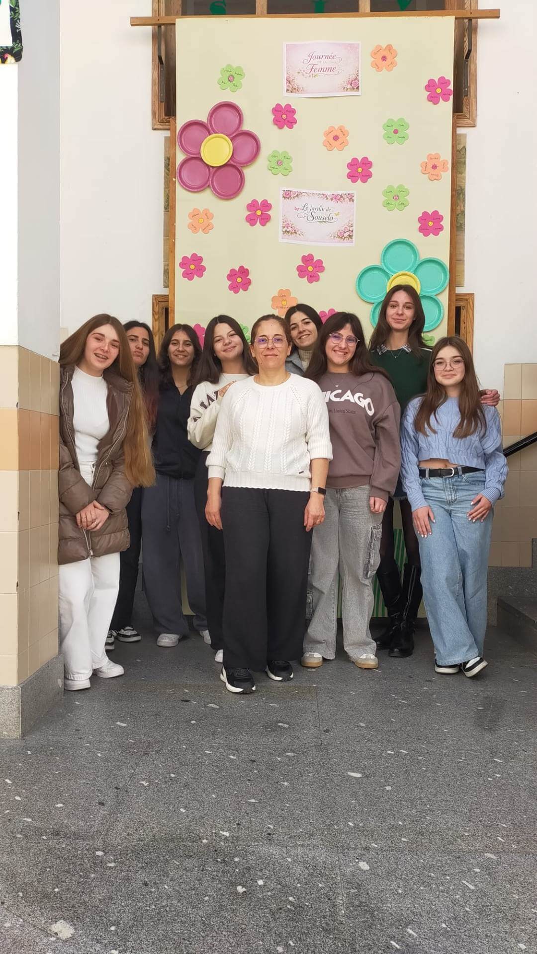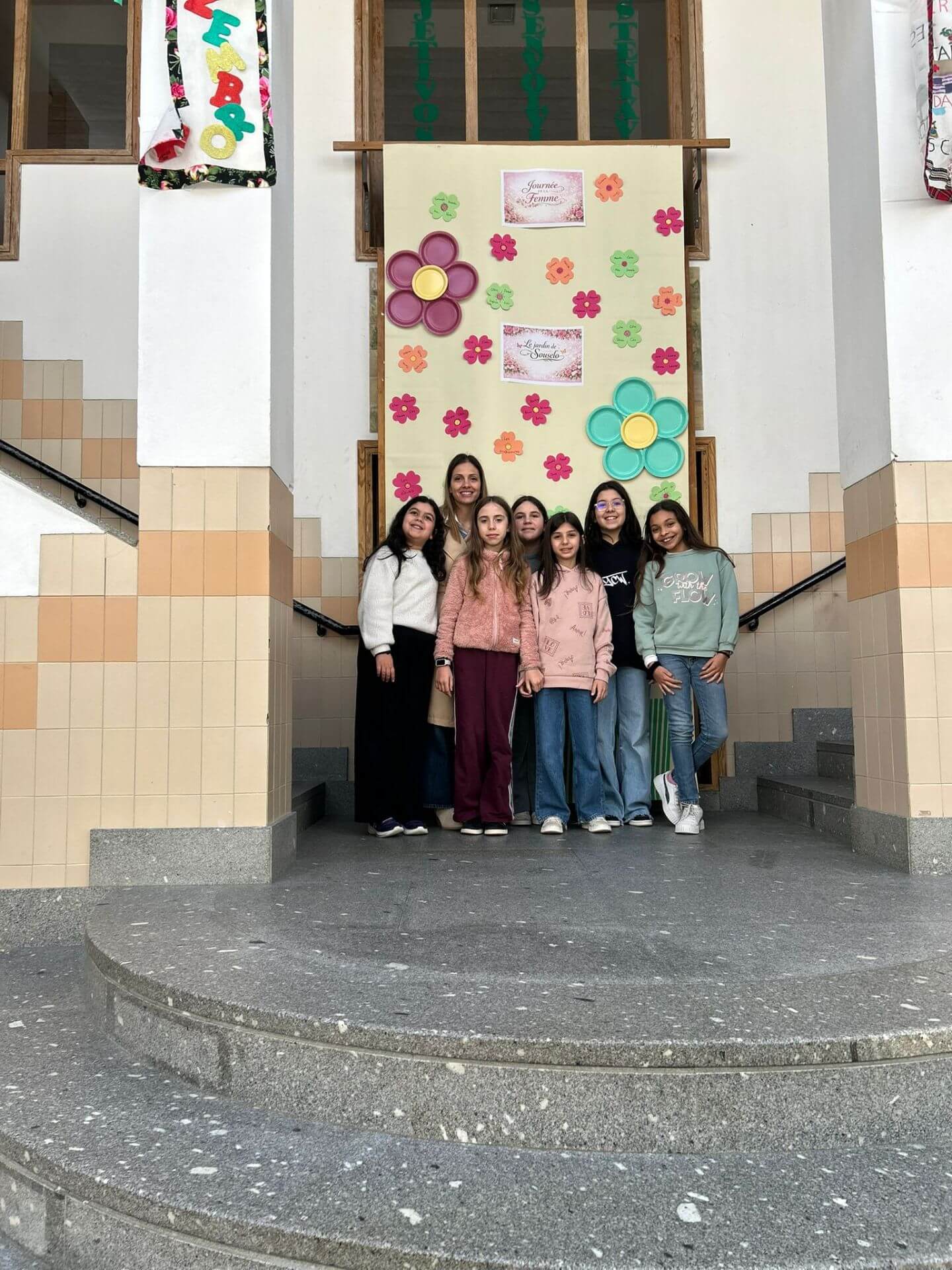No átrio da escola foi preparado um cenário decorativo com flores coloridas e a expressão francesa “Le jardin de Souselo”, criando um espaço simbólico dedicado à celebração das mulheres. Este cenário, criado por todos as turmas do terceiro ciclo, permaneceu exposto durante vários dias, convidando alunas, professoras e assistentes a registarem o momento com fotografias em frente ao painel. 🌸