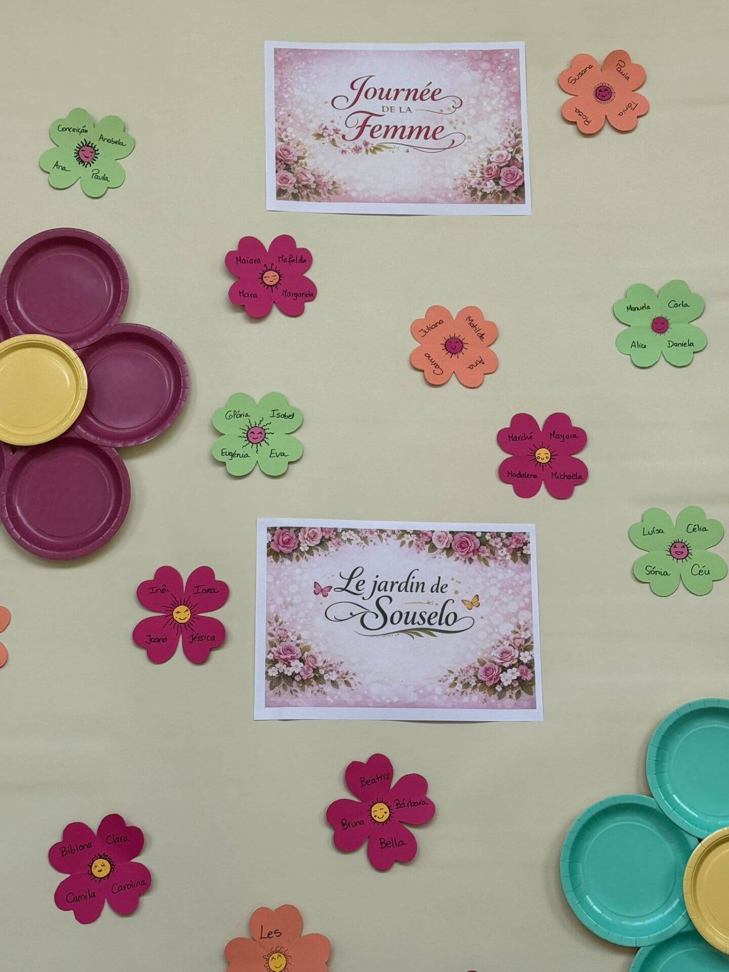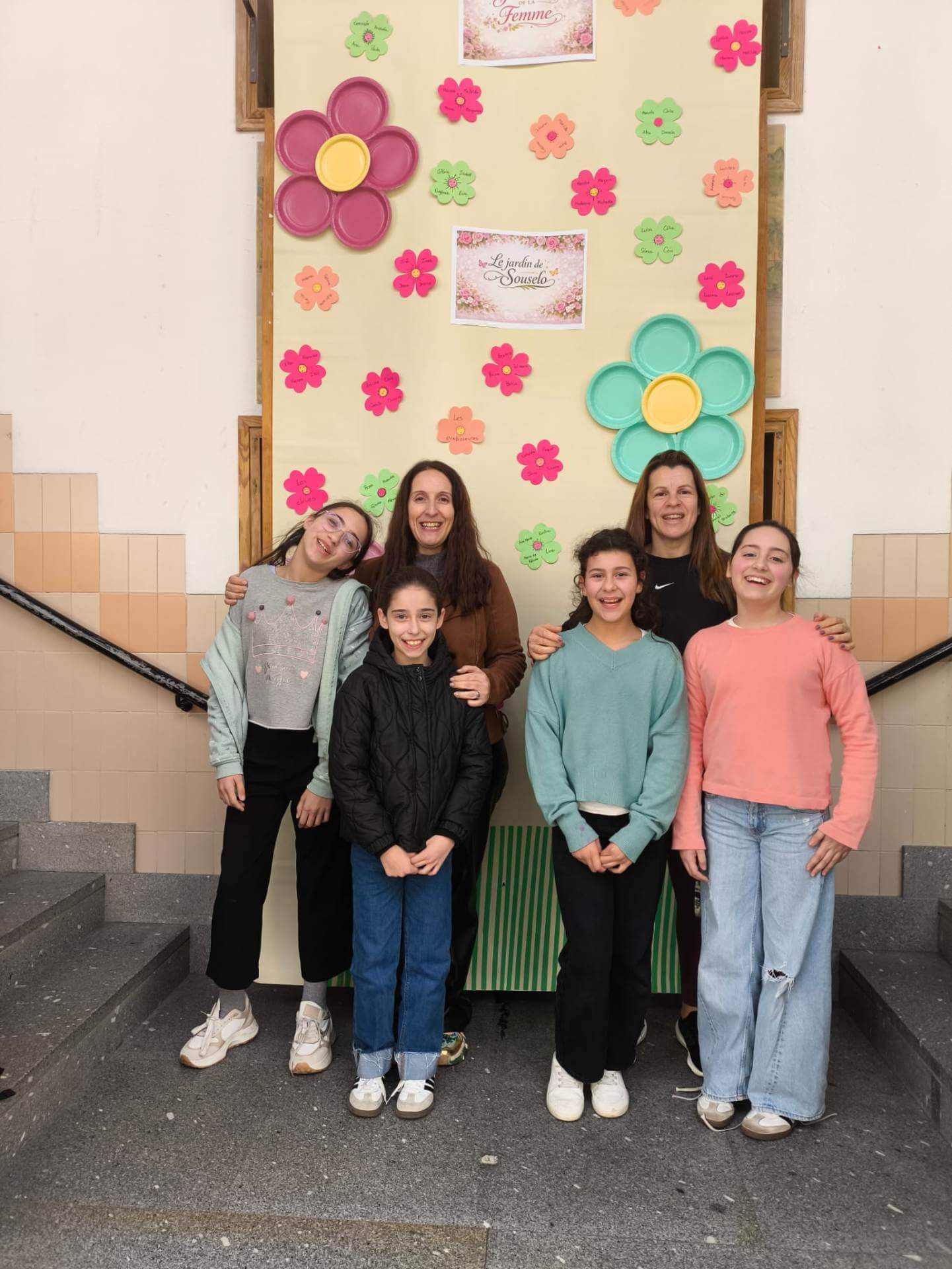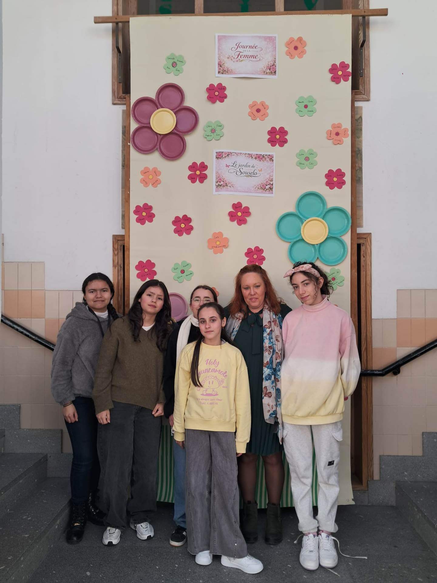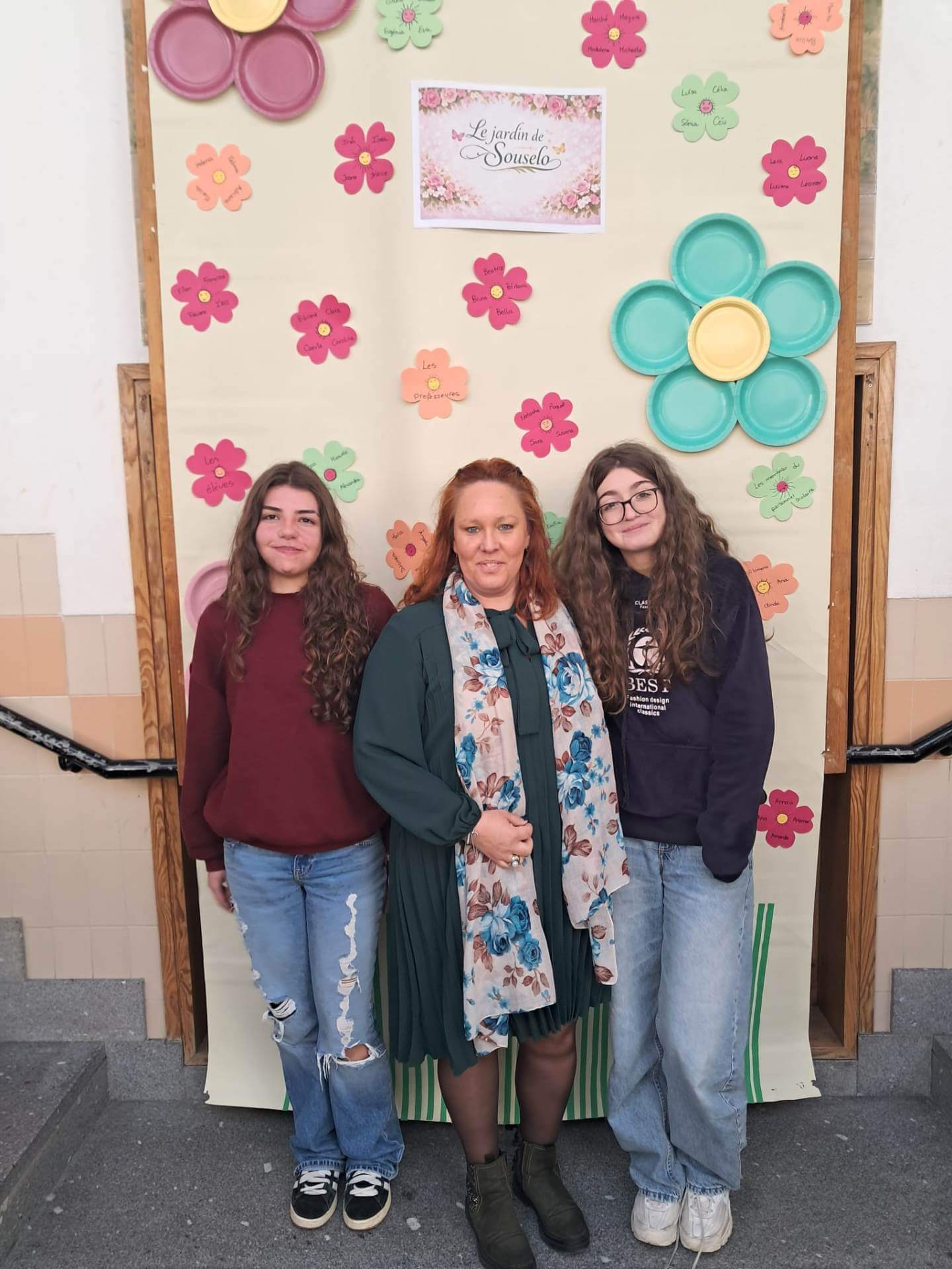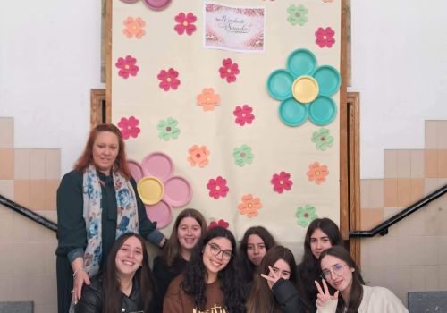No átrio da escola foi preparado um cenário decorativo com flores coloridas e a expressão francesa “Le jardin de Souselo”, criando um espaço simbólico dedicado à celebração das mulheres. Este cenário, criado por todos as turmas do terceiro ciclo, permaneceu exposto durante vários dias, convidando alunas, professoras e assistentes a registarem o momento com fotografias em frente ao painel. 🌸