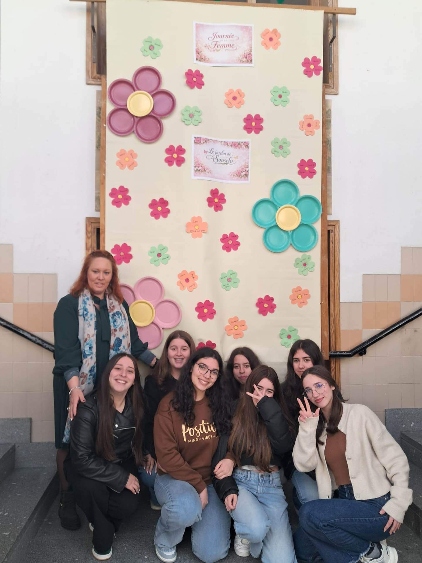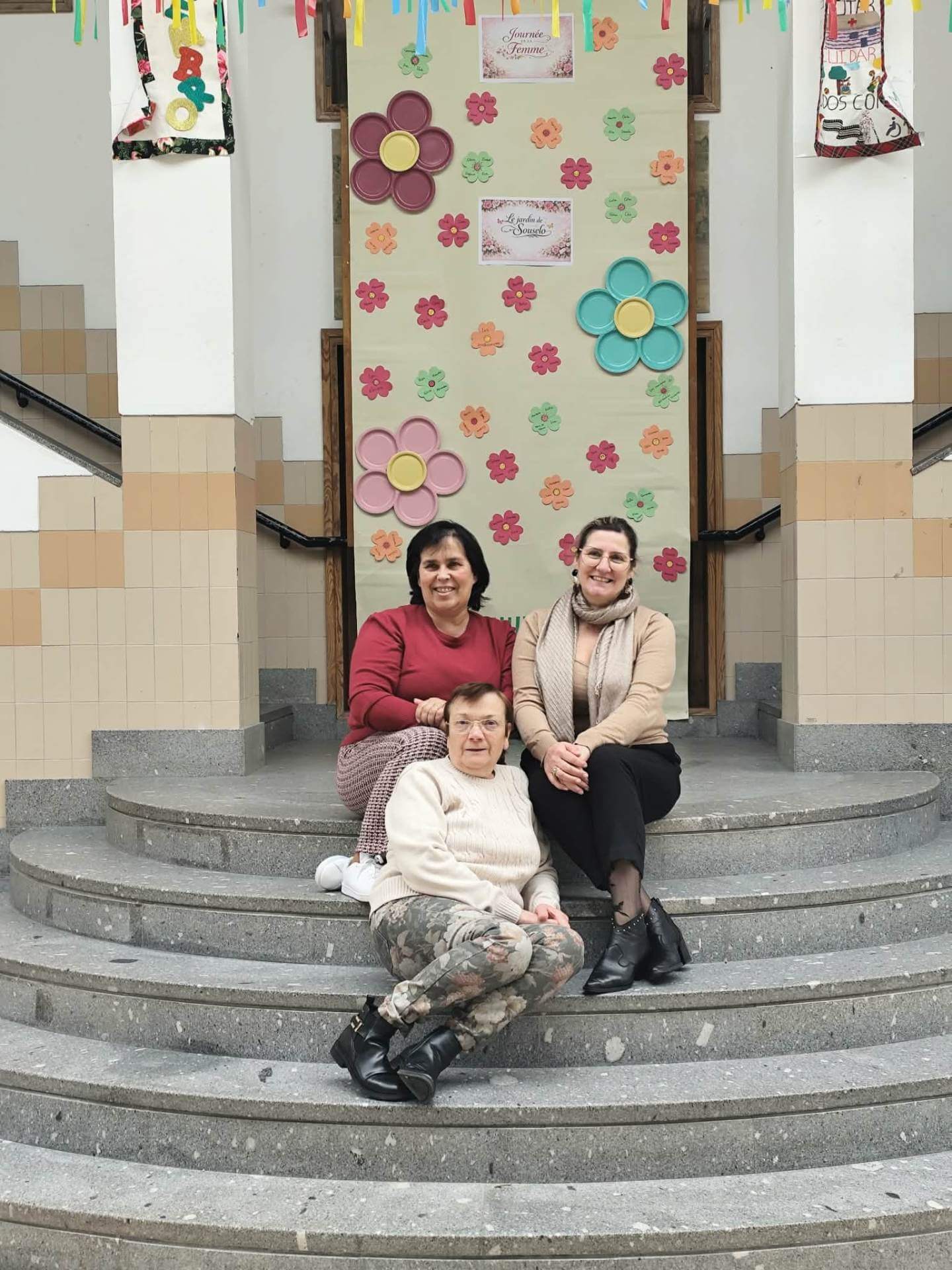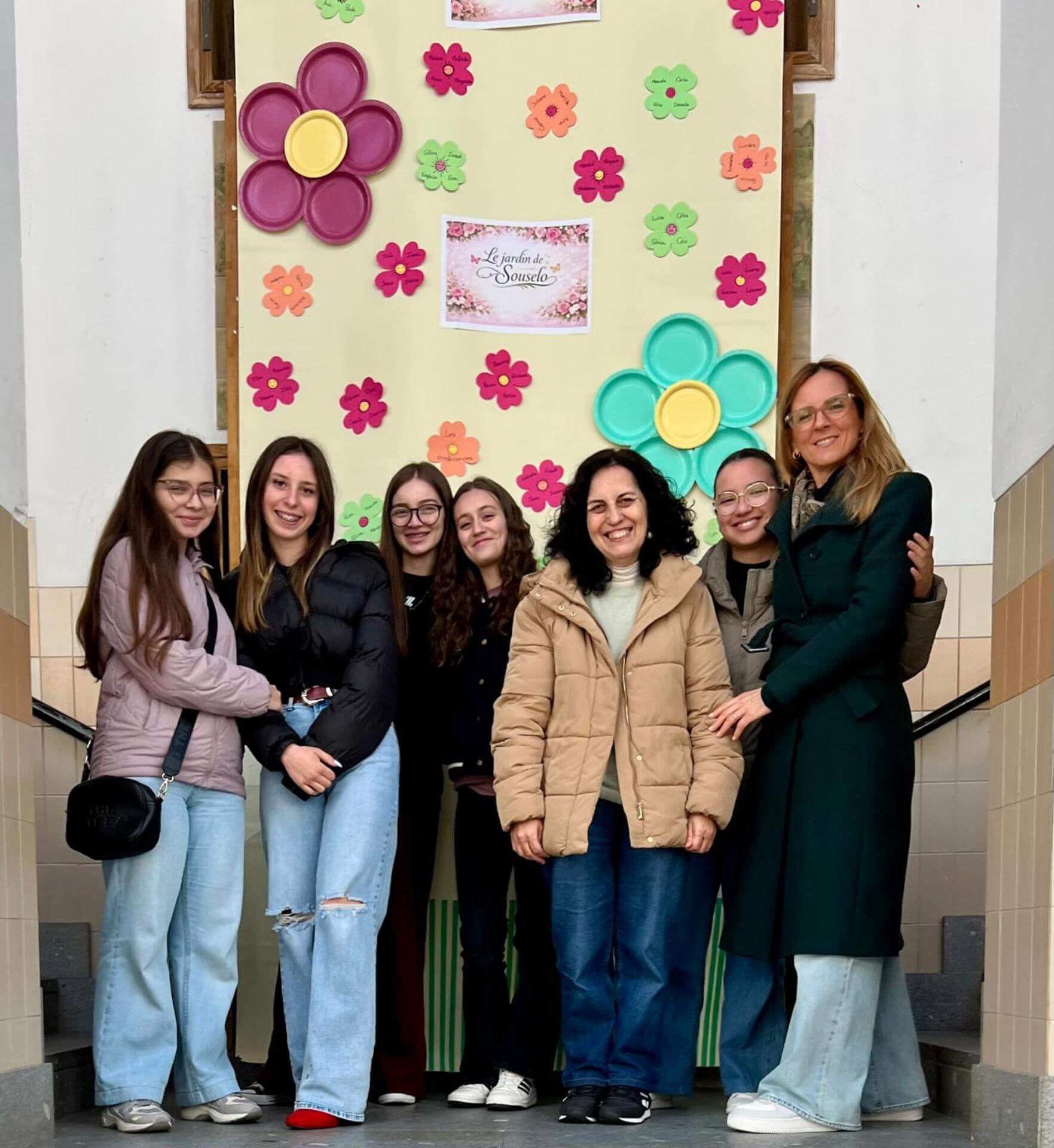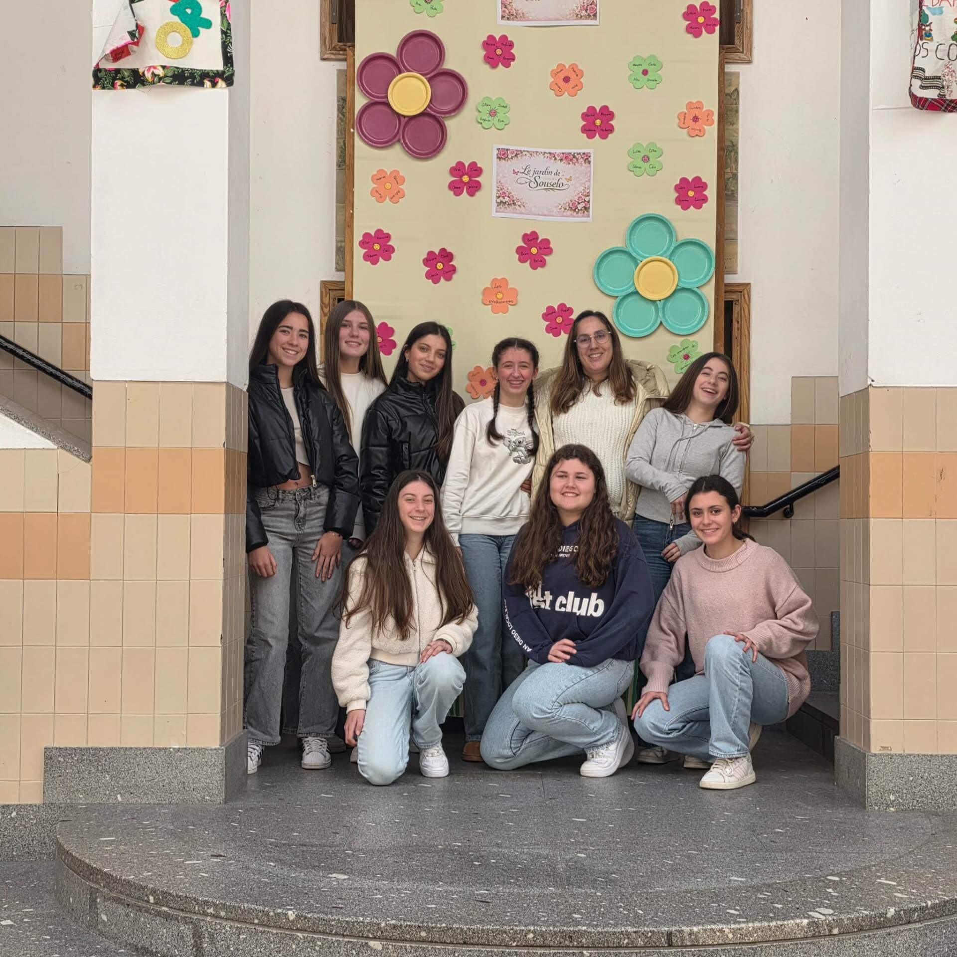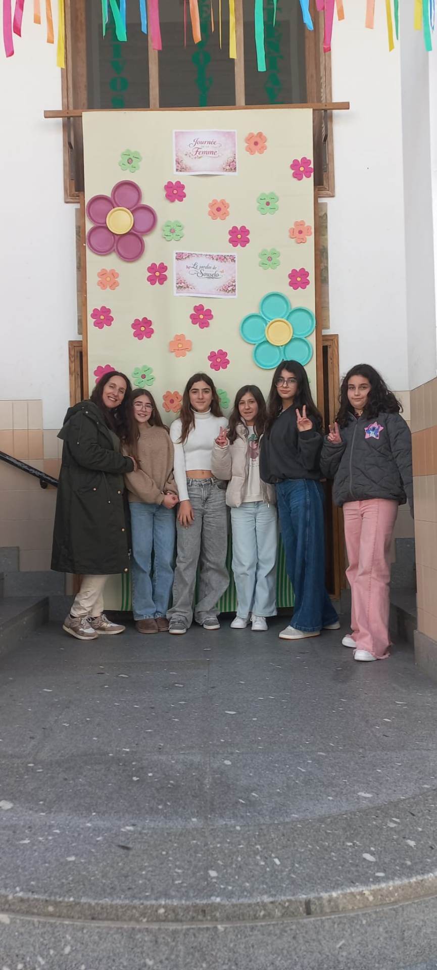No átrio da escola foi preparado um cenário decorativo com flores coloridas e a expressão francesa “Le jardin de Souselo”, criando um espaço simbólico dedicado à celebração das mulheres. Este cenário, criado por todos as turmas do terceiro ciclo, permaneceu exposto durante vários dias, convidando alunas, professoras e assistentes a registarem o momento com fotografias em frente ao painel. 🌸