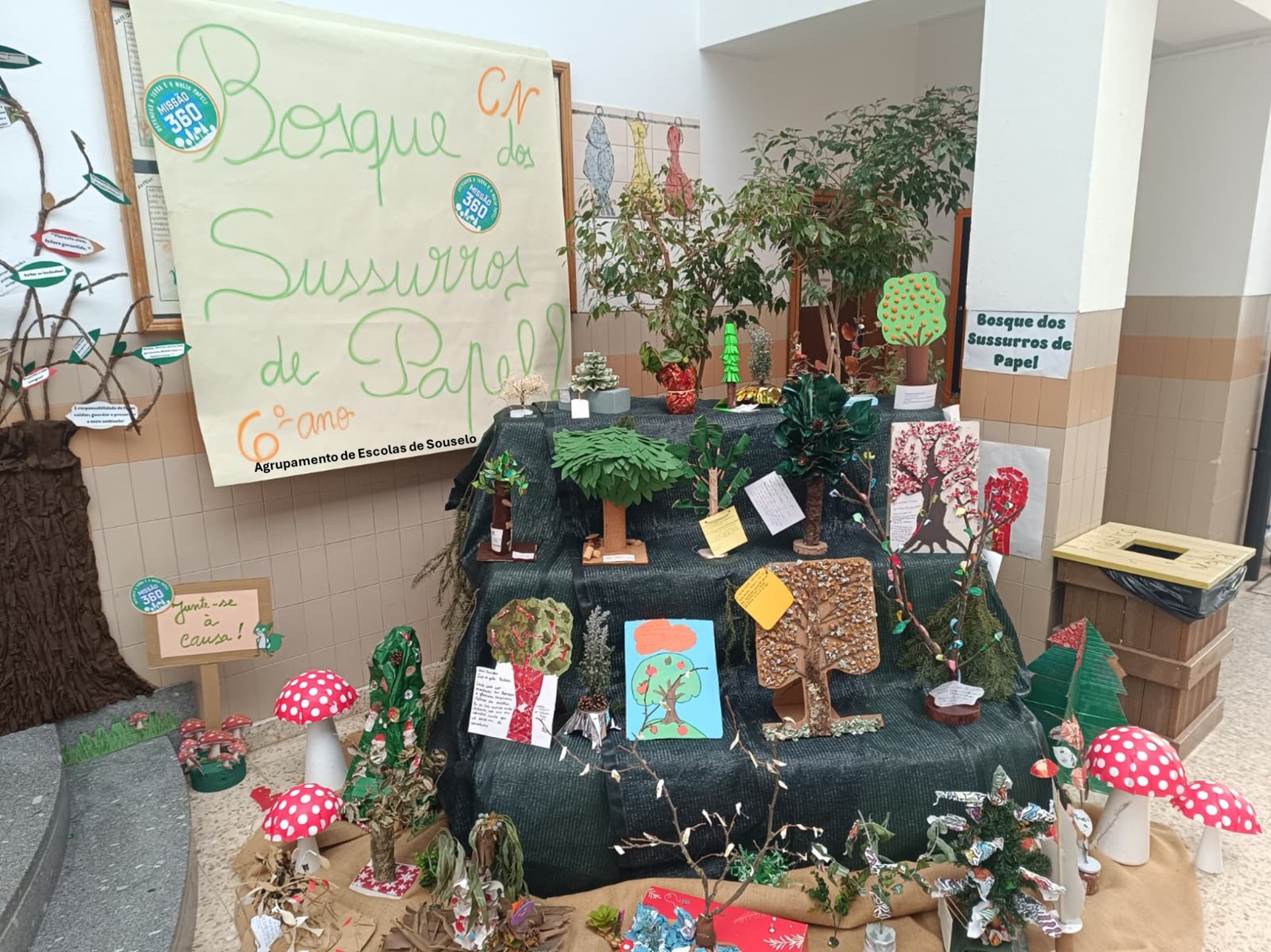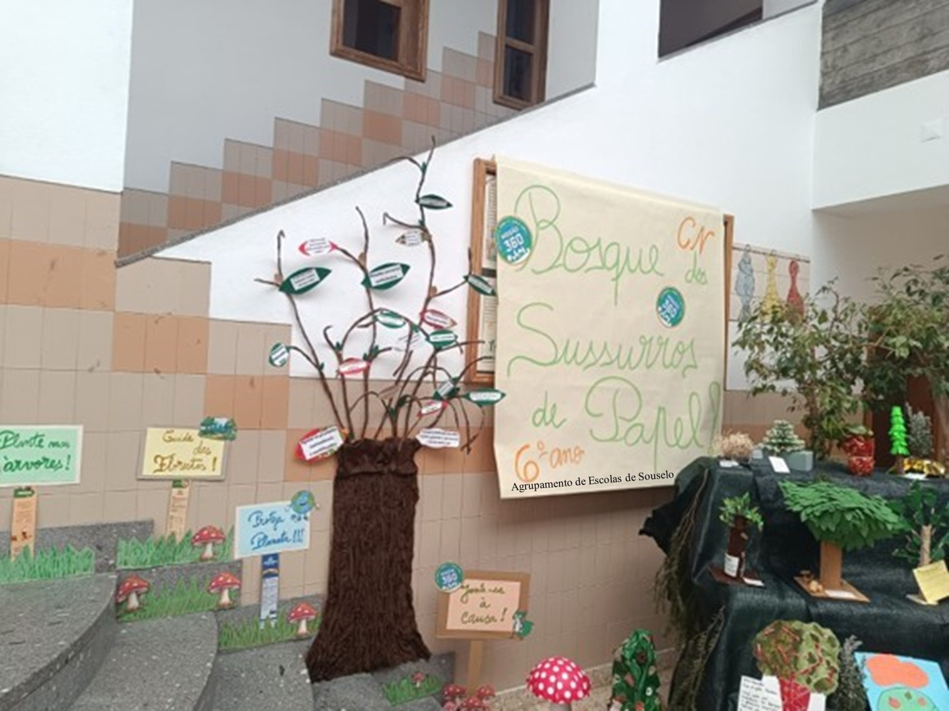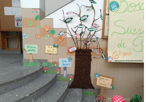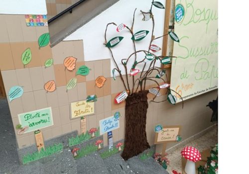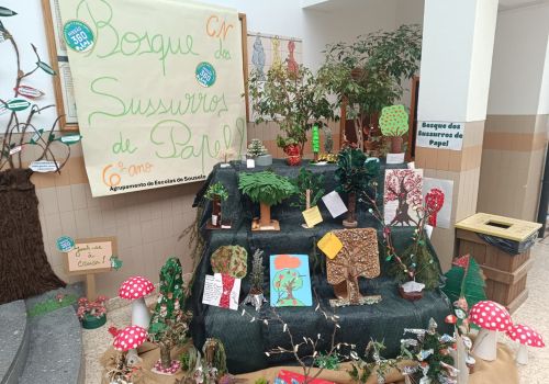 Em janeiro, após o regresso às aulas, no átrio da escola, os trabalhos das três turmas deram origem ao fantástico “Bosque dos Sussurros de Papel”, onde foram integradas mensagens de sensibilização ambiental e boas práticas para a proteção das florestas.